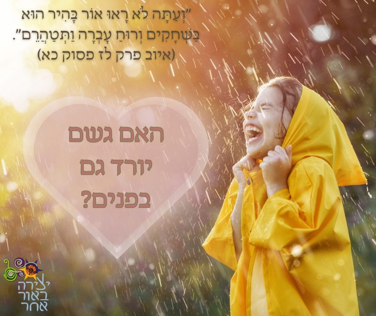 אמנם גשום וקר, אבל הגשם הוא מים ומים הם חיים! וכל אחת יכולה לייצר חיים כאלה בתוכה. לכל אחת יש את הגשם שלה שיורד בפנים…ששוטף ומטהר ועוזר לה להיות פנוייה להכיל את עצמה ממקום אמיתי באמת.